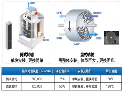 根據(jù)處理風量、VOCs成分的不同,可以選擇筒式轉輪或者盤式轉輪進行處理。