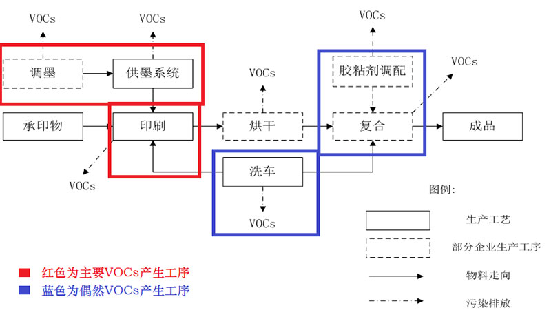 1、客戶采用溶劑型油墨,溶劑成分較復雜,VOCs排量較大。VOCs的主要產生工序如下圖: