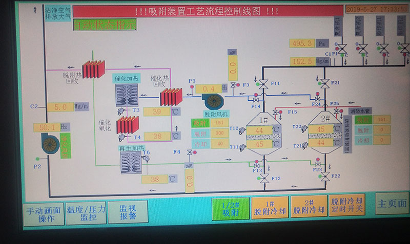 5、為了節約投資和運行費用,系統采用兩個活性炭吸附箱,一備一用,偶爾在三條生產線全開的情況下,兩箱同時啟用;白天吸附,晚上錯峰用電期間啟動脫附再生和催化燃燒裝置,最大程度的節約了運行費用。/6、系統采用PLC全自動控制,可切換手動模式。配備VOC濃度在線監測聯動、脫附和催化燃燒溫度在線監測聯動、自動噴淋消防系統聯動,一鍵啟動,安全無憂。